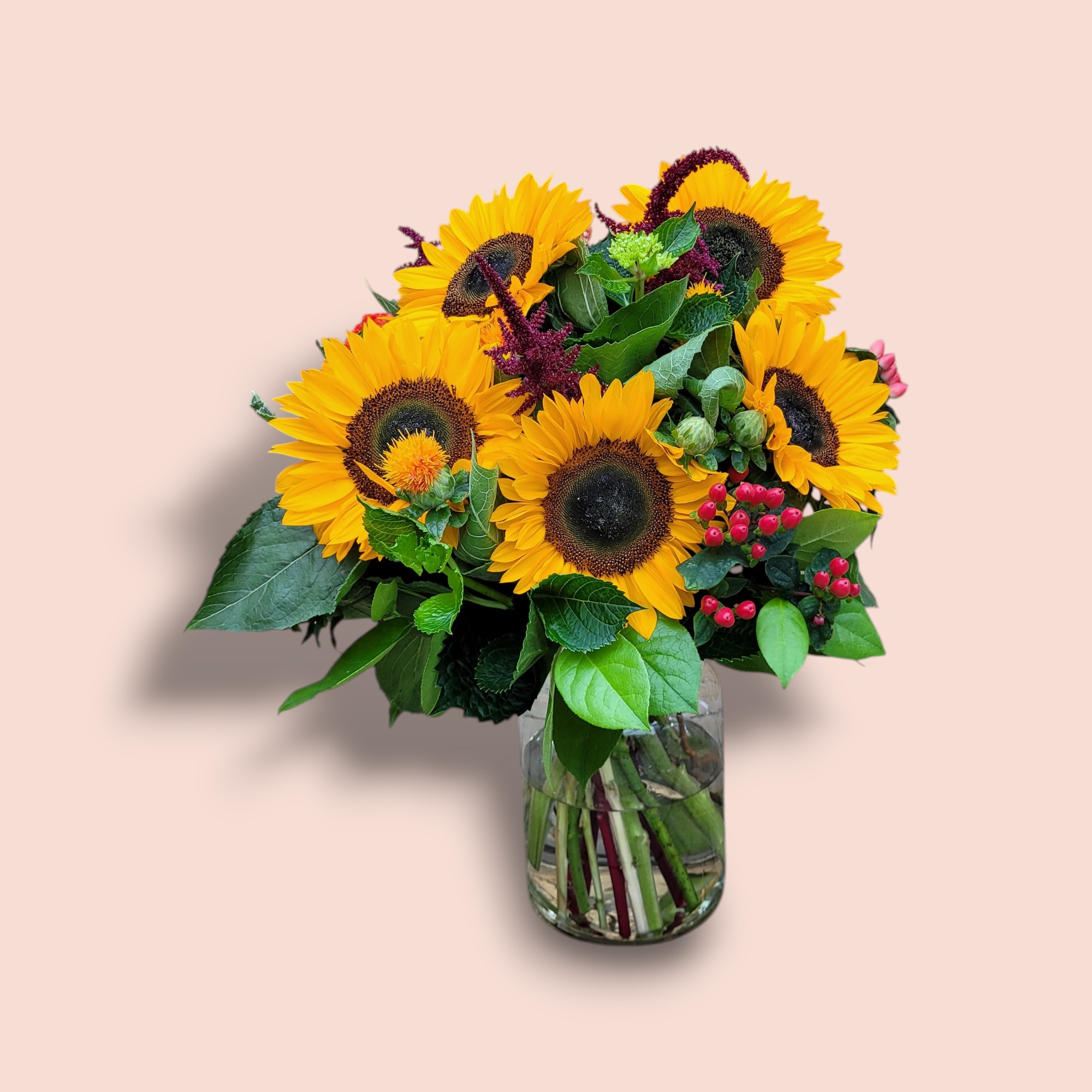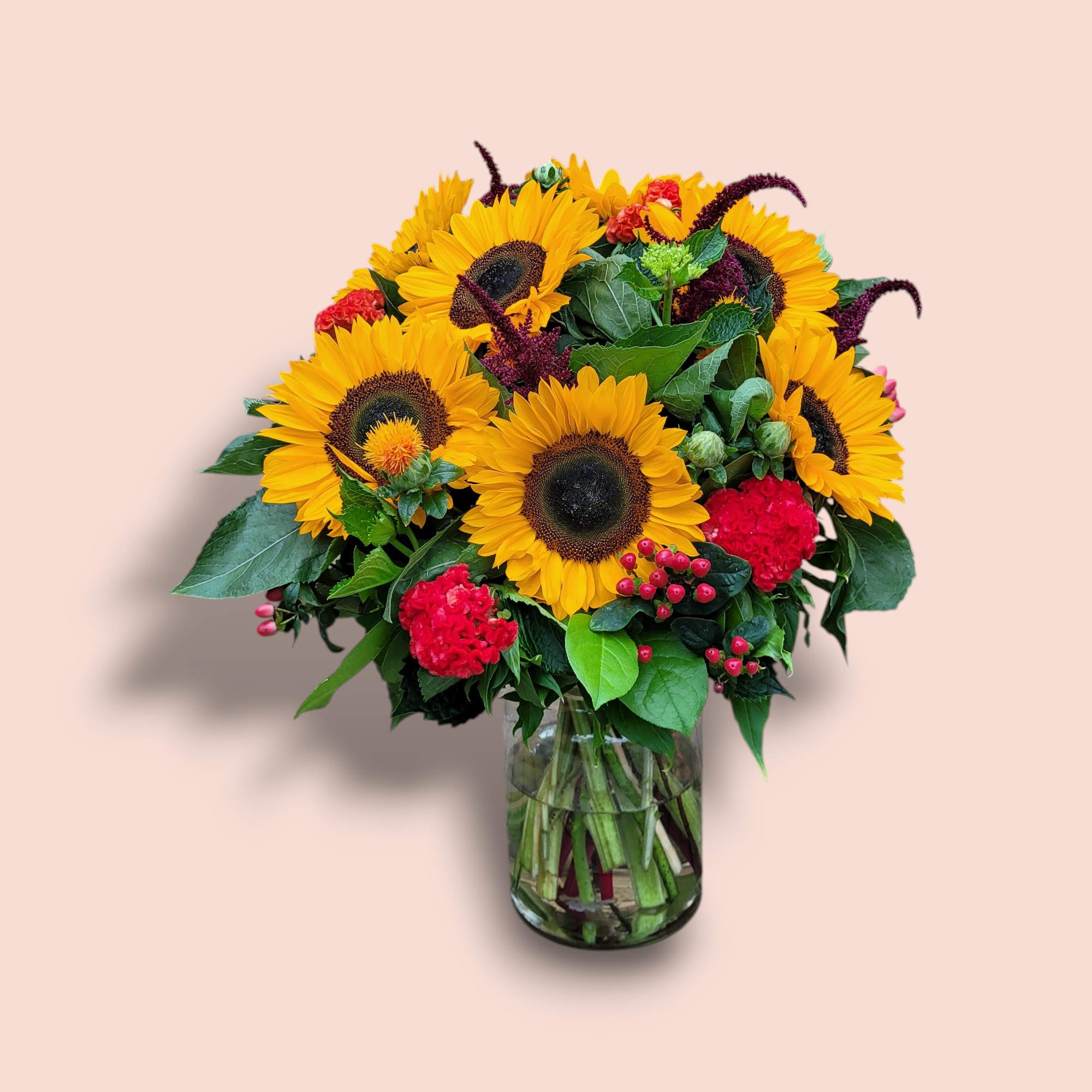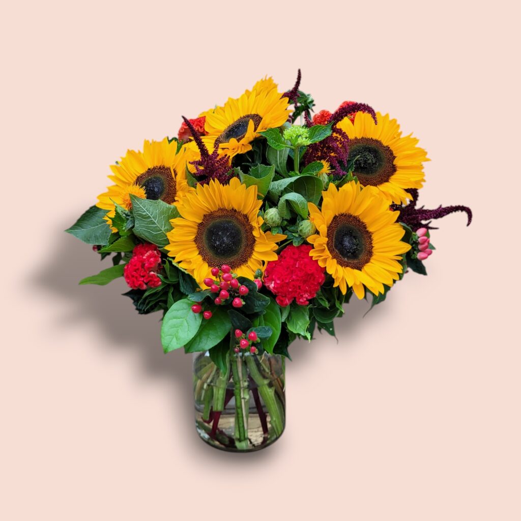Haal de warmte van een zwoele nazomeravond in huis met het boeket Late Summer Night. Alsof de zon langzaam ondergaat en de avond zijn warme gloed over het lang legt. De stralende zonnebloemen brengen licht en vrolijkheid, de Amaranthus zorgt voor een vleugje mysterie en elegantie. Samen vormen ze een prachtig contrast dat doet denken aan een nazomer avond.