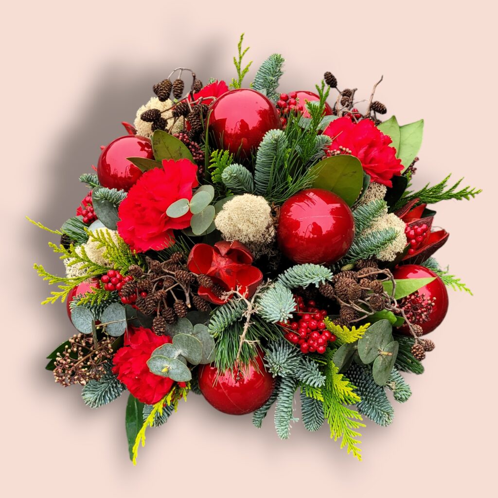 Door de beschikbaarheid van de bloemen kan het kerststuk iets afwijken van de foto. Ook de gebruikte ornamenten kunnen door beschikbaarheid variëren.
