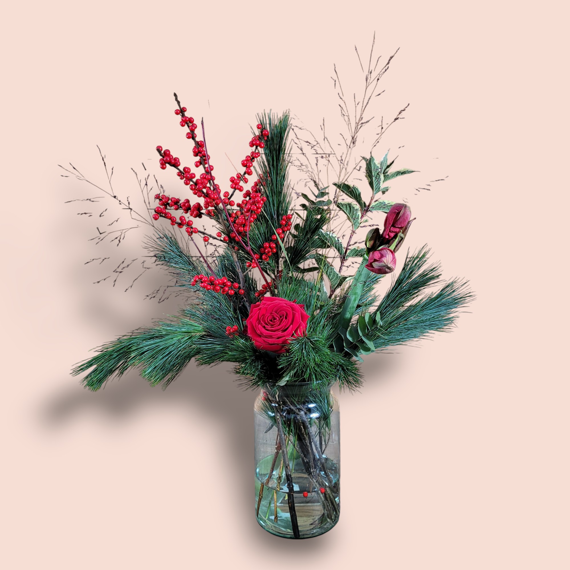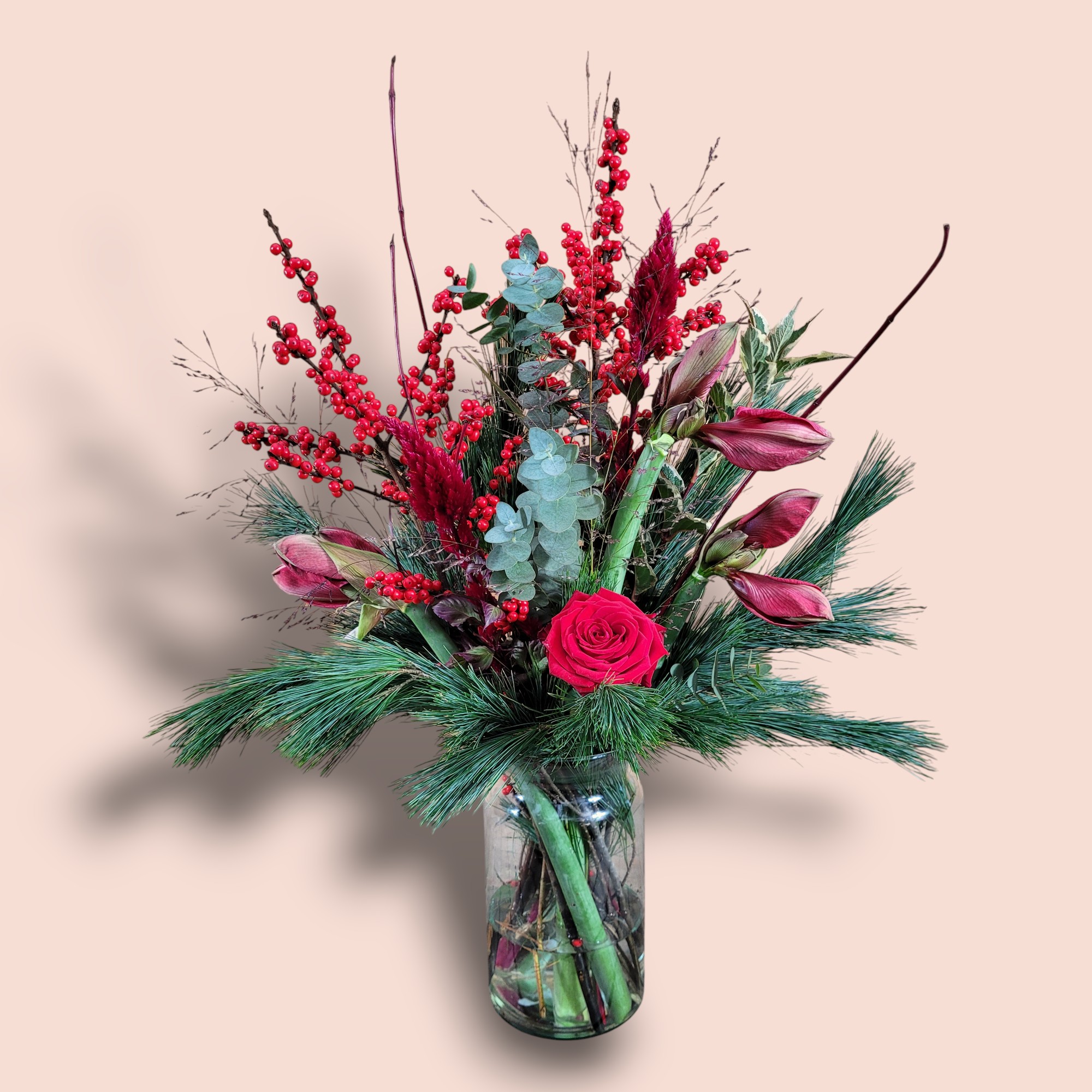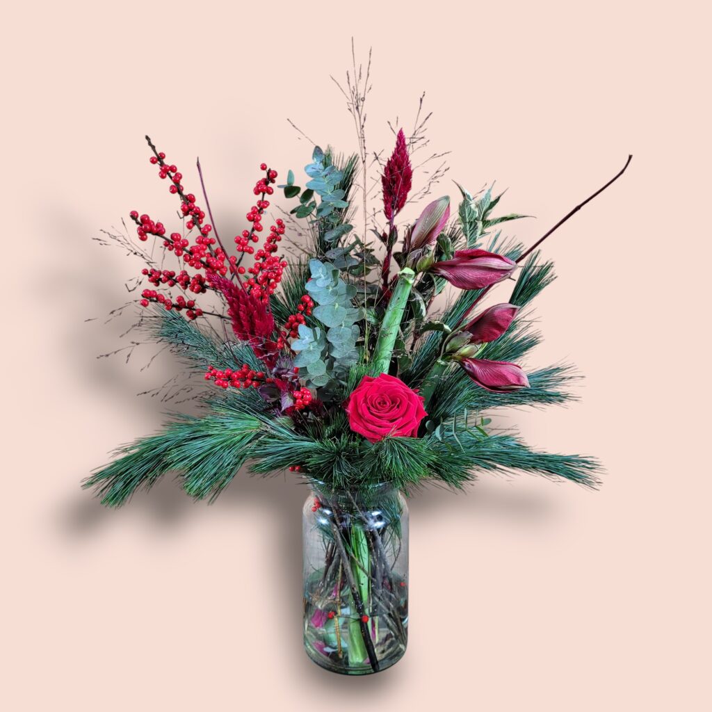 Boeket Rode Amaryllis is een stijlvolle ode aan de winter. Dit boeket brengt niet alleen kleur en geur in huis, maar ook een vleugje feestelijke luxe, een ideaal cadeau! Een stijlvolle mix van rode Amaryllis, eucalyptus, pinusgroen en Ilex bessen.
